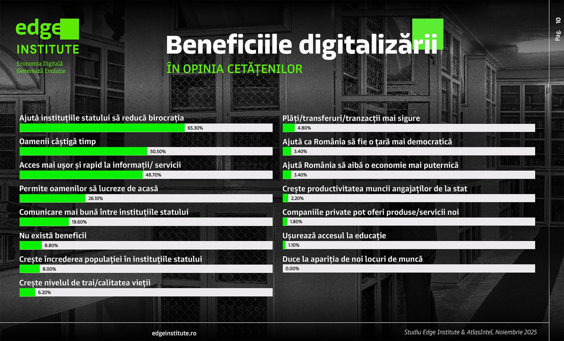 Studiul AtlasIntel pentru Edge Institute din noiembrie 2025 arată că peste 65% dintre români consideră că digitalizarea are un impact major în diminuarea birocrației, iar 1 din 2 respondenți susține că digitalizarea conduce la timp economisit.