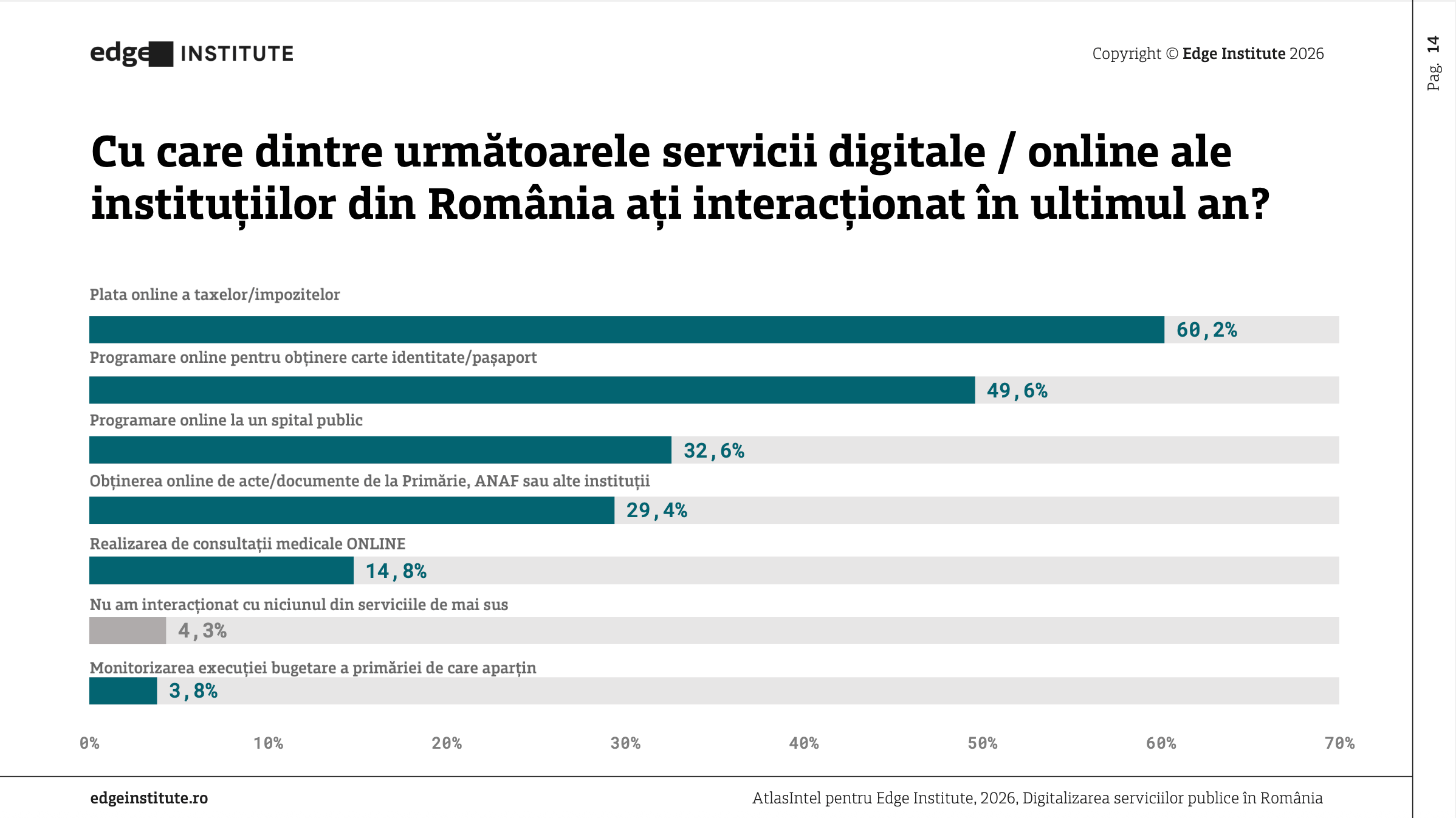 Tiparele de utilizare a serviciilor publice digitale rămân, în mare parte, constante între cele două ediții ale sondajului. Plata online a taxelor și impozitelor continuă să domine, la un nivel de aproximativ 60–66% dintre respondenți, iar programările la spitalele publice se mențin la 33%. Cea mai clară evoluție apare însă în zona obținerii de acte personale, inclusiv pașaport sau carte de identitate, unde ponderea urcă de la 26% în noiembrie la 50% în martie.