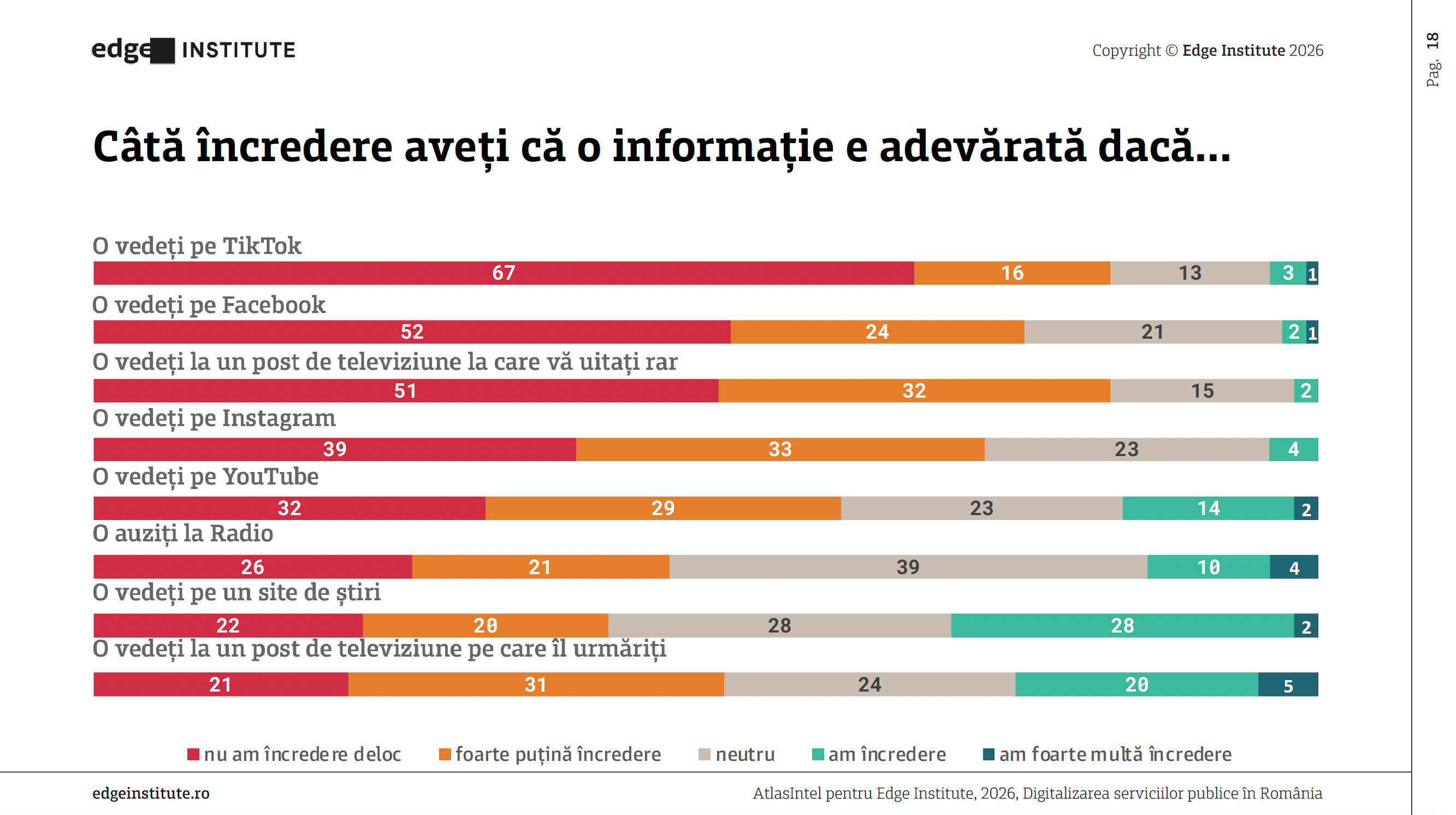 Tot legat de platformele media, un aspect interesant din sondaj este legată de credibilitatea surselor de informație. YouTube a crescut de la 6% la 16%. Radio a crescut de la 14% la 23%, site-urile de știri de la 20% la 30%, iar posturile de televiziune cu rating mare de la 20% la 25%. Paradoxal, valorile pentru TikTok sau Facebook au reieșit foarte mici din sondaj, cu mai puțin de 5% din respondenți afirmând că au încredere în aceste rețele. În practică, influența lor este mult mai mare.