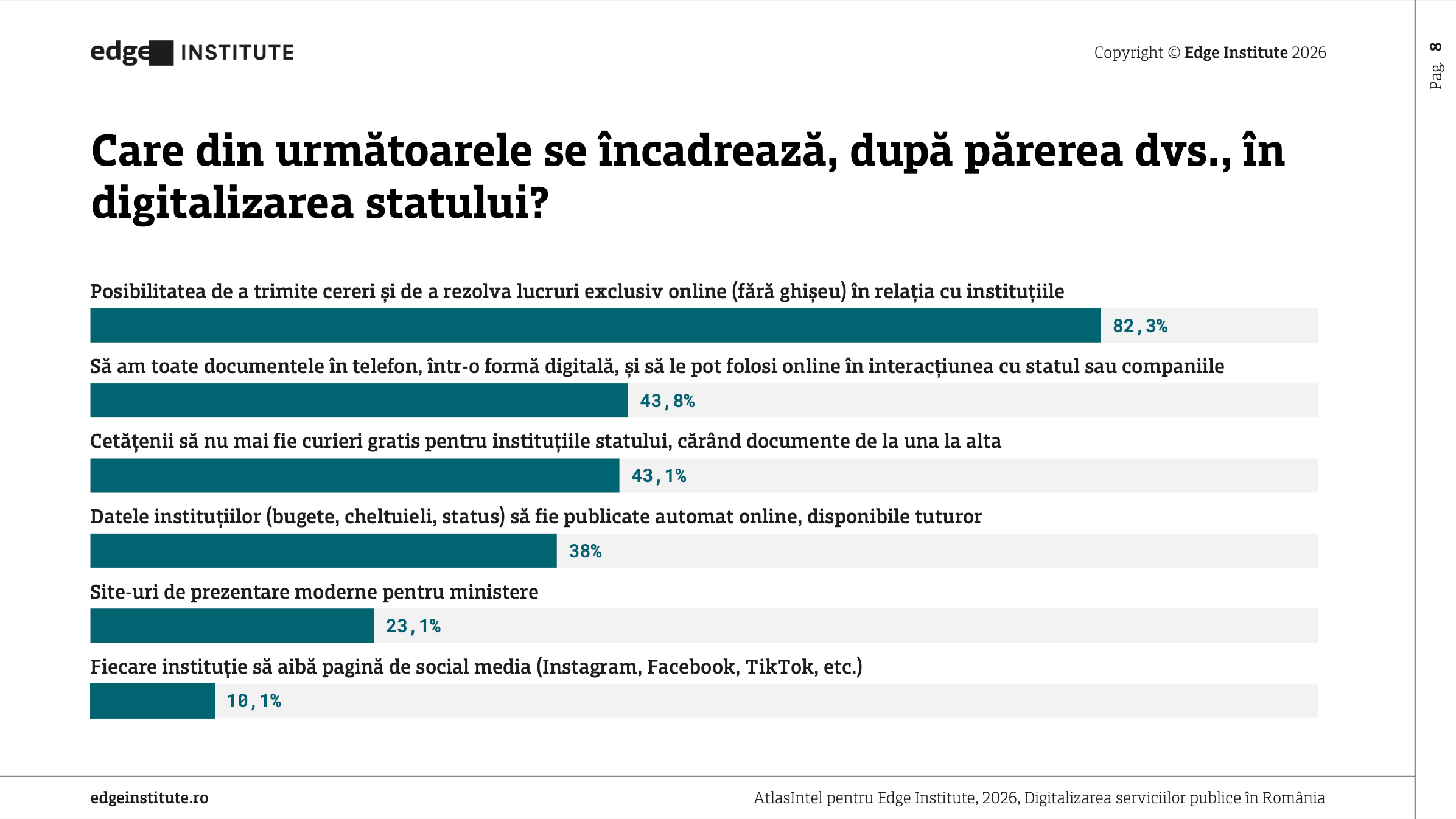 Regăsim și un paradox aici, și-anume faptul că majoritatea românilor își doresc digitalizarea, dar consideră că statul nu o coordonează corespunzător. Gradul de digitalizare a fost evoluat ca fiind parțial sau redus de către 83% din respondenții ambelor sondaje. Acest aspect este reflectat și în evaluarea ritmului digitalizării instituțiilor, evaluat drept lent sau foarte lent de către 87% din respondenți în martie 2026, respectiv 84% în noiembrie 2025.