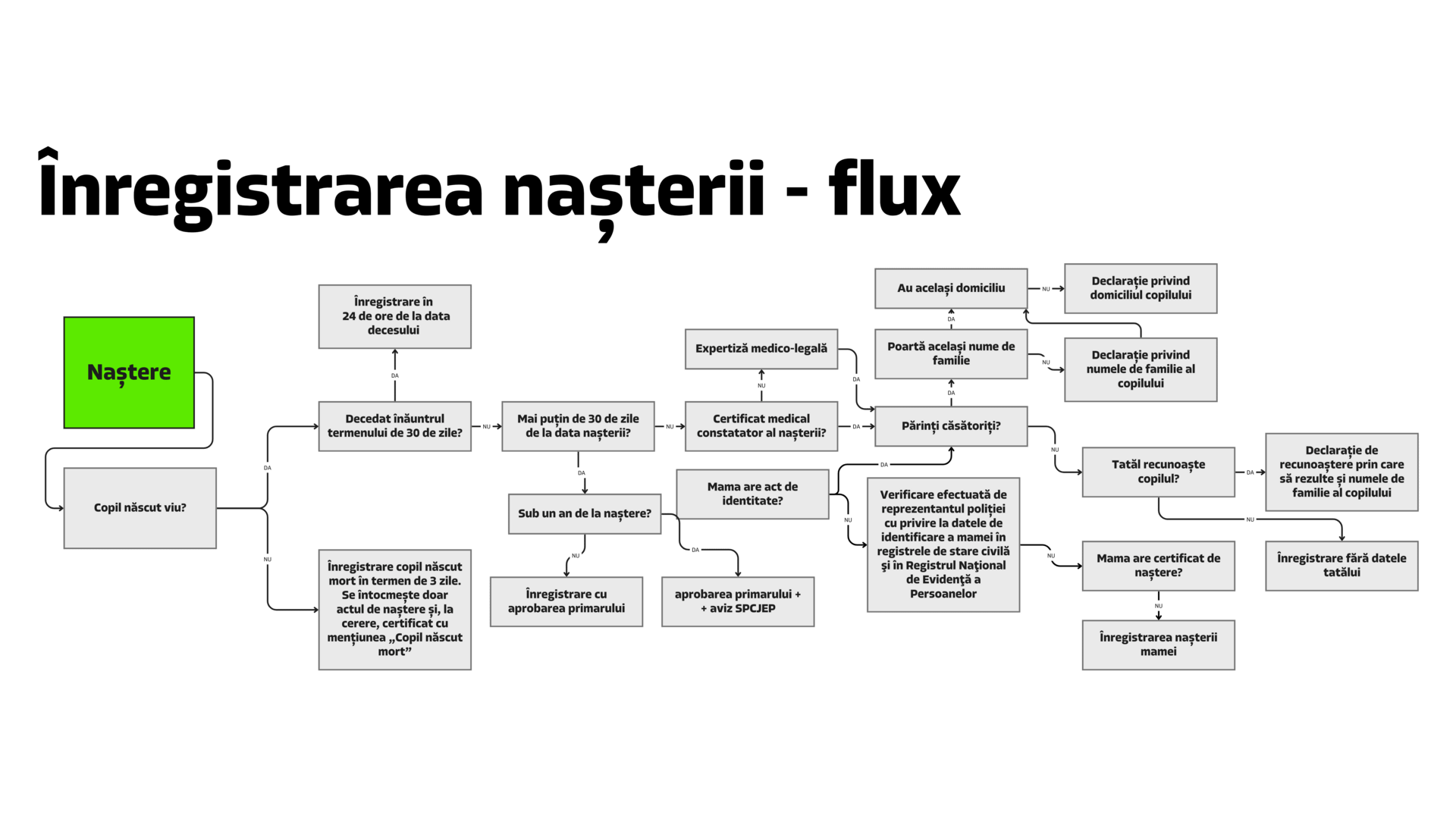 Există zeci de scenarii pentru înregistrarea nașterii, pe câteva dintre ele le-am mapat mai jos. Cu excepția situațiilor speciale (înregistrare tardivă, lipsă certificat medical care constată nașterea, părinți fără acte de identitate) nu există motive pentru care să nu ducem procedura în format electronic, așa cum au făcut-o țări precum Estonia sau Portugalia.