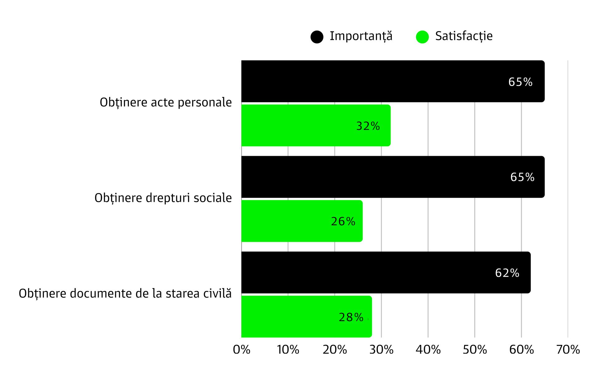 Figura de mai jos ilustrează importanța disponibilității online a anumitor demersuri în percepția cetățenilor, respectiv satisfacția asociată acestor servicii publice electronice în prezent.