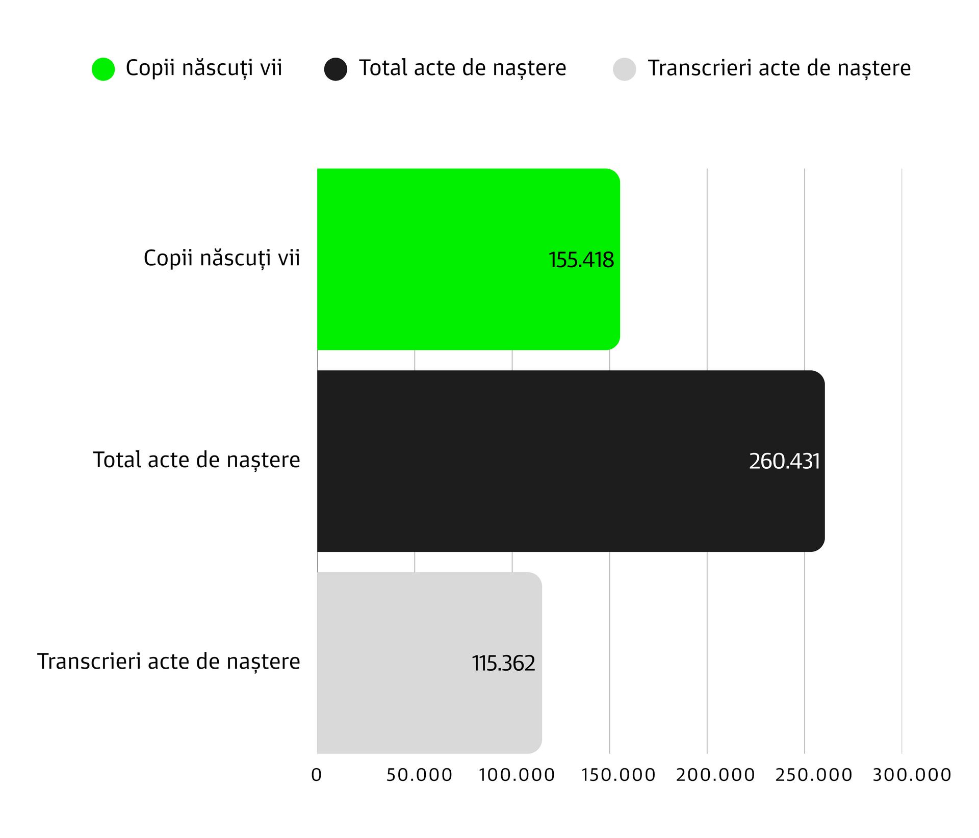 Mai jos este reflectat numărul de copii născuți în România în anul 2023, în contrast cu numărul de acte de naștere emise.