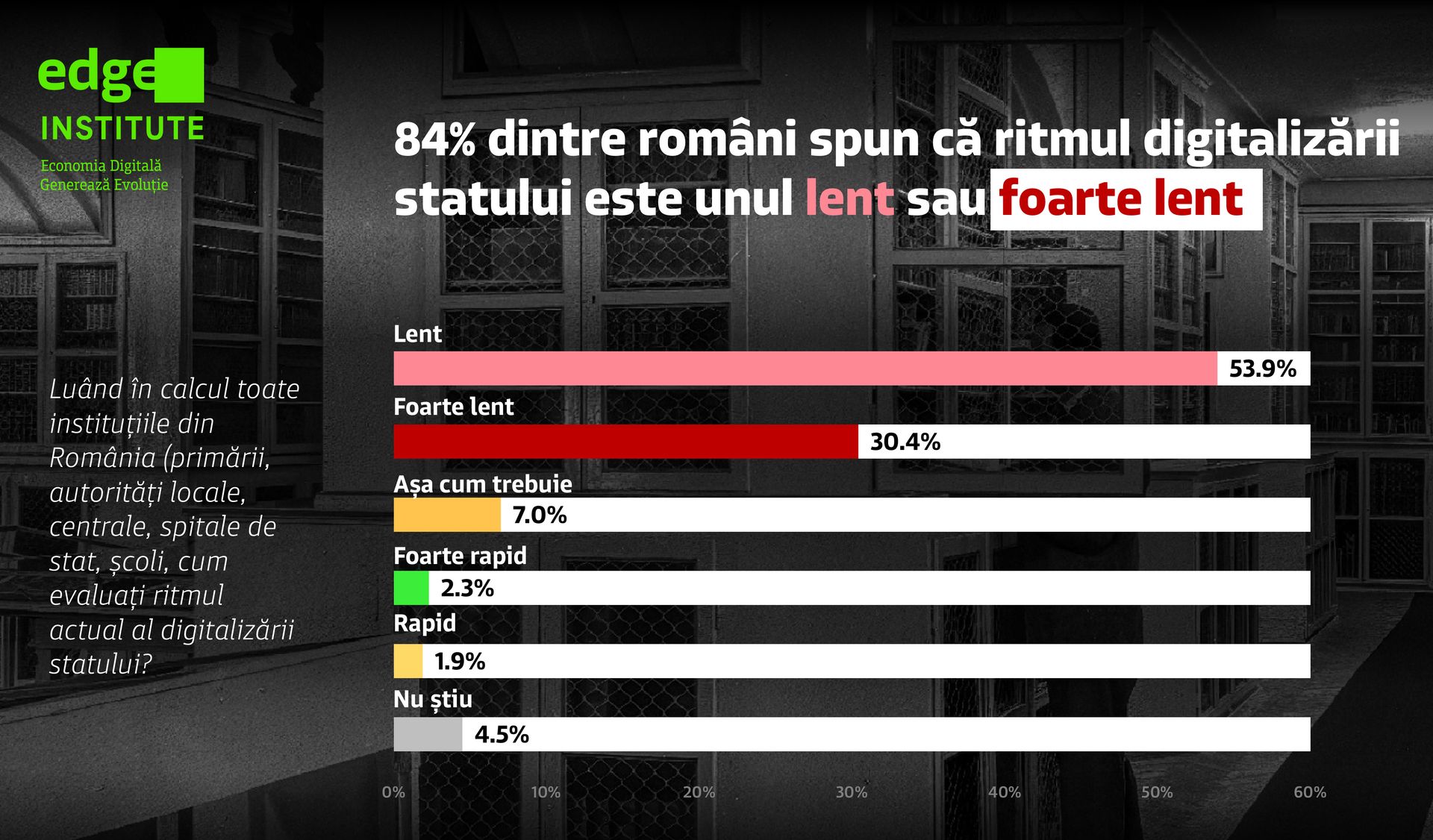 În același timp, ritmul digitalizării serviciilor publice este perceput drept lent (53,9%) și foarte lent (30,4%) de către o majoritate covârșitoare a acestora.