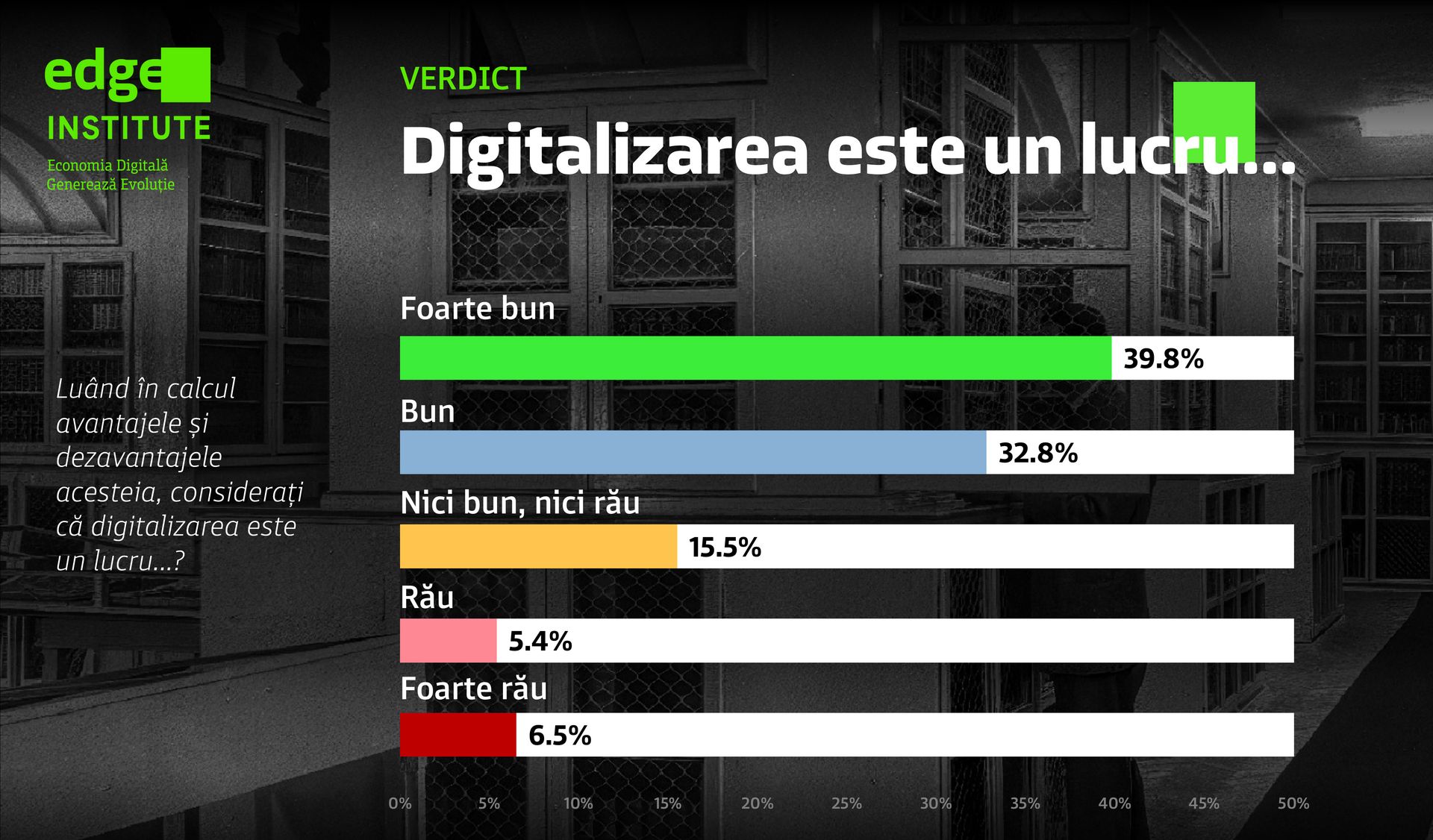 Aproape trei sferturi dintre români consideră că digitalizarea este un lucru bun (32,8%) și foarte bun (39,8%).